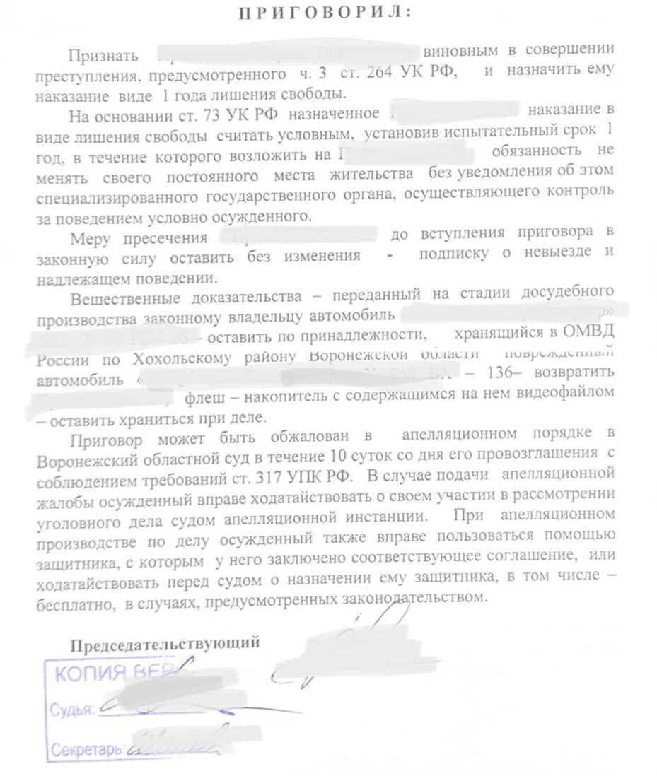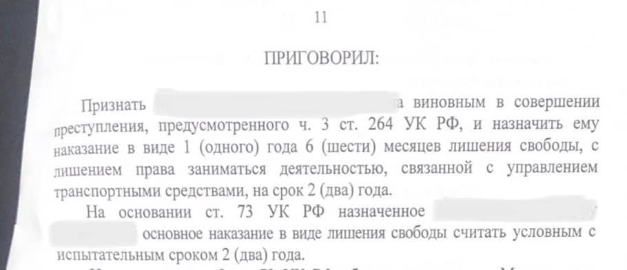 МОЙ РЕЗУЛЬТАТ: 1 год 6 месяцев УСЛОВНО с лишением права управлять транспортным средством 2 года!